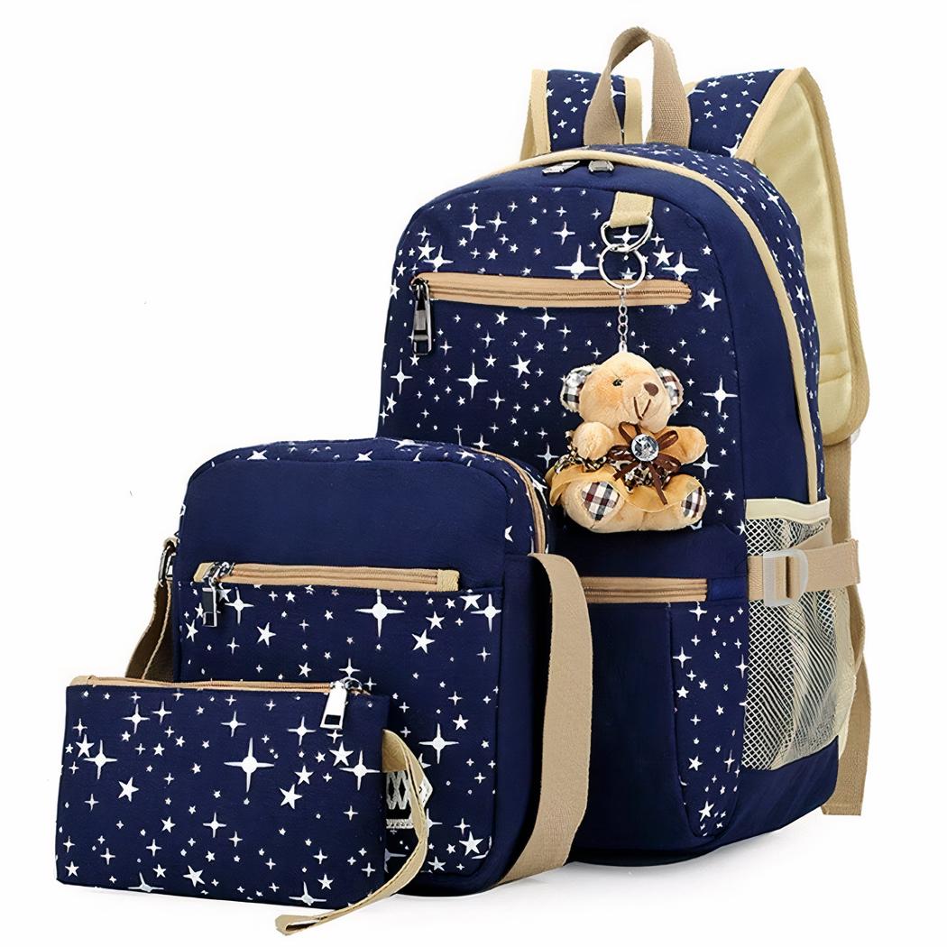 Ecco un bellissimo zaino stellato con ciondolo a forma di orso, di tre serie: piccolo trouss, zaino a tracolla e zaino! Questa borsa è perfetta per donne, ragazze adolescenti. Può essere utilizzata per trasportare il computer al lavoro o a scuola che cercano qualità e comodità. Lo zaino è dotato di un caro ciondolo a forma di orso, perfetto per aggiungere un tocco di stile a qualsiasi outfit