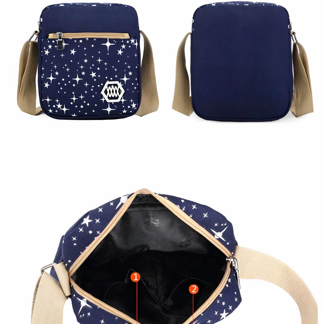 Il motivo a stelle bianche e blu sul morbido tessuto di cotone offre un tocco divertente e colorato, mentre il ciondolo a forma di cuore dell’orsetto aggiunge un ulteriore tocco di morbidezza. La spaziosa tasca principale e le tasche laterali offrono un comodo spazio per riporre tutti i suoi oggetti essenziali.